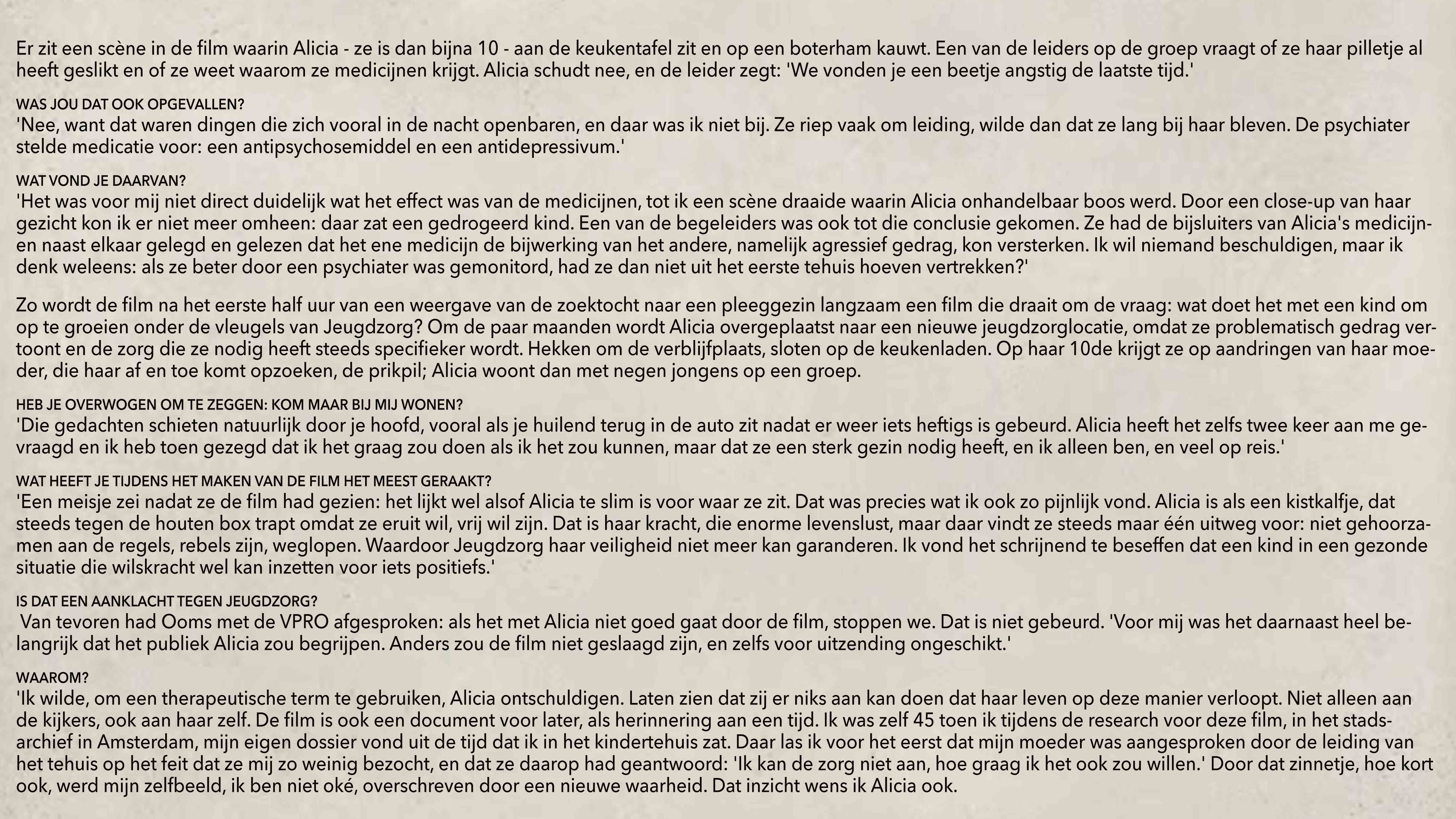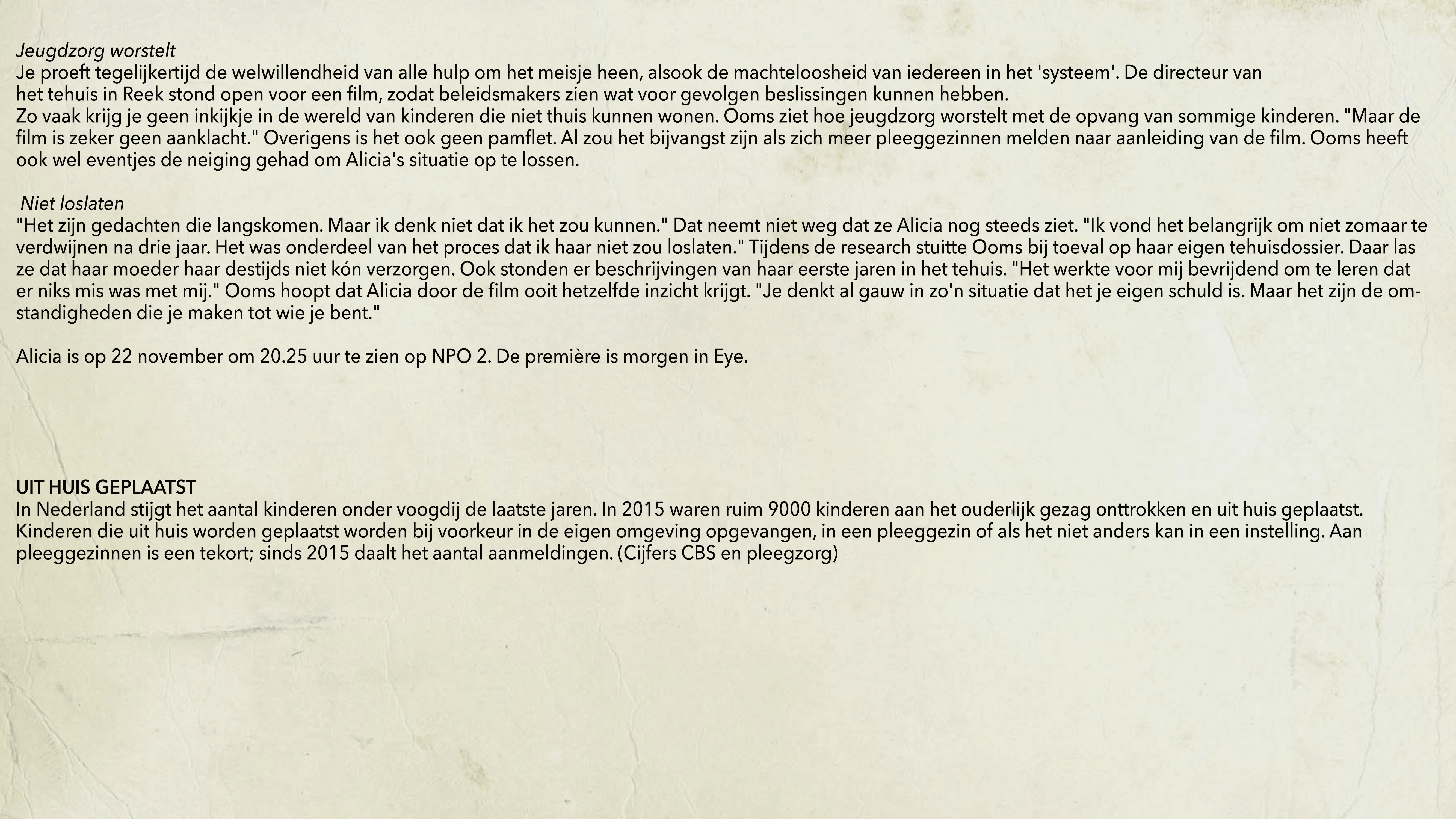 Alicia is één jaar oud als ze uit huis wordt geplaatst. Via een pleeggezin komt ze op vijfjarige leeftijd terecht in een kindertehuis in afwachting van een plaatsing in een nieuw pleeggezin. Als ze negen is zit ze daar nog steeds. Dit is het moment waarop de documentaire ALICA begint.