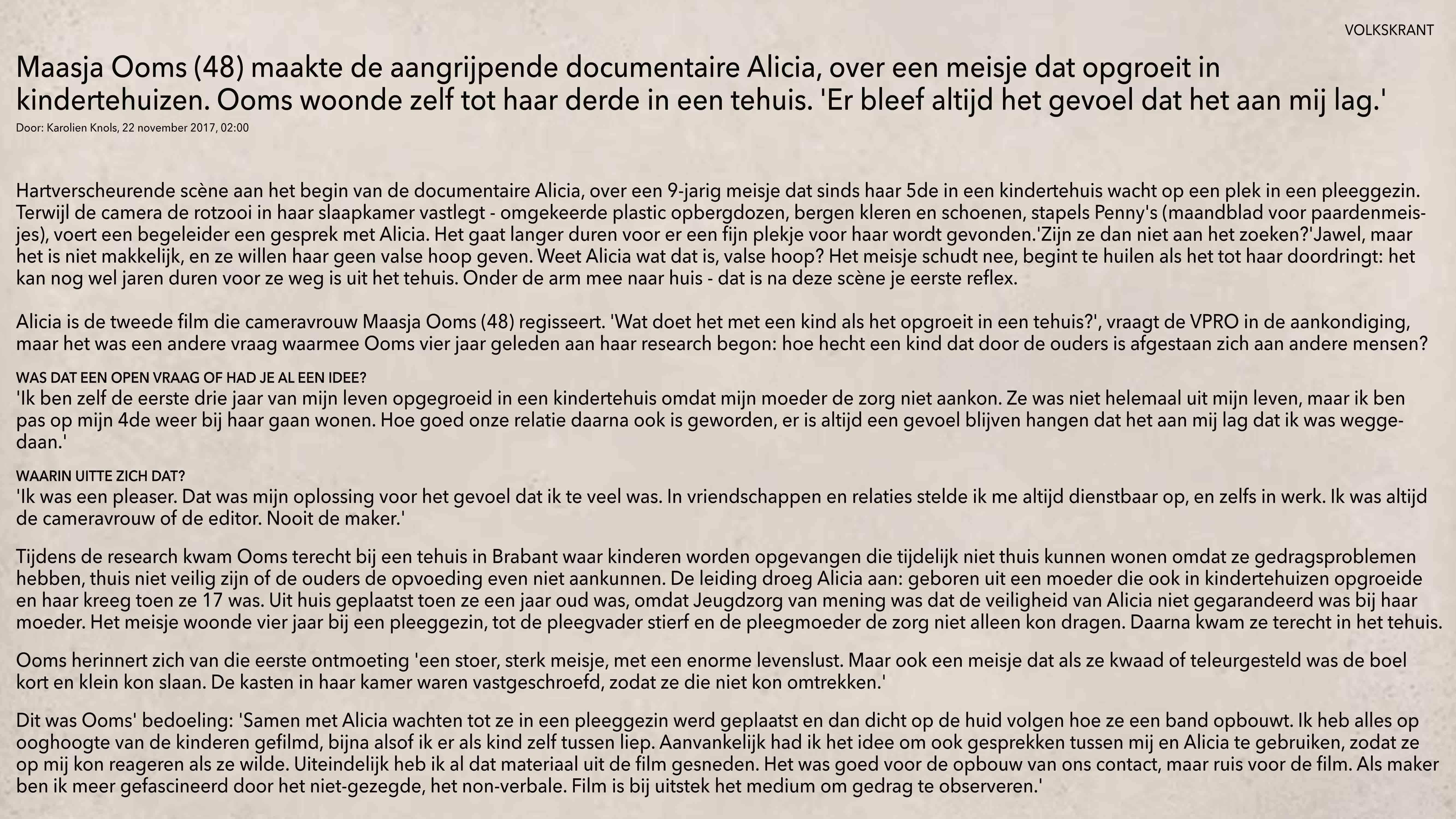 "The award for best TV documentary Prix Italia 2018 was chosen by the jury unanimously. The winner is the Dutch documentary « Alicia » - made by the excellent one woman-team Maasja Ooms, coproduced by VPRO Television. The film « Alicia » is not only a powerful portrait of a young girl drifting from foster family care to life in institutions. It's also a portrait of a system that is not working, social heritage and lack of love. A sensitive subject treated with warm compassion without judging the absent mother or the social workers. The documentary shows excellence in all aspects of filmmaking: best directing, best camera work, best storytelling and best editing. It's beautifully put together with emotional breaks to help the audience breath, and reflect. It punches us in the stomach with a message we never will forget. The prize doesn't only go to the filmmaker - we also want to dedicate it to Alicia herself for sharing her life with us. Thank you!"